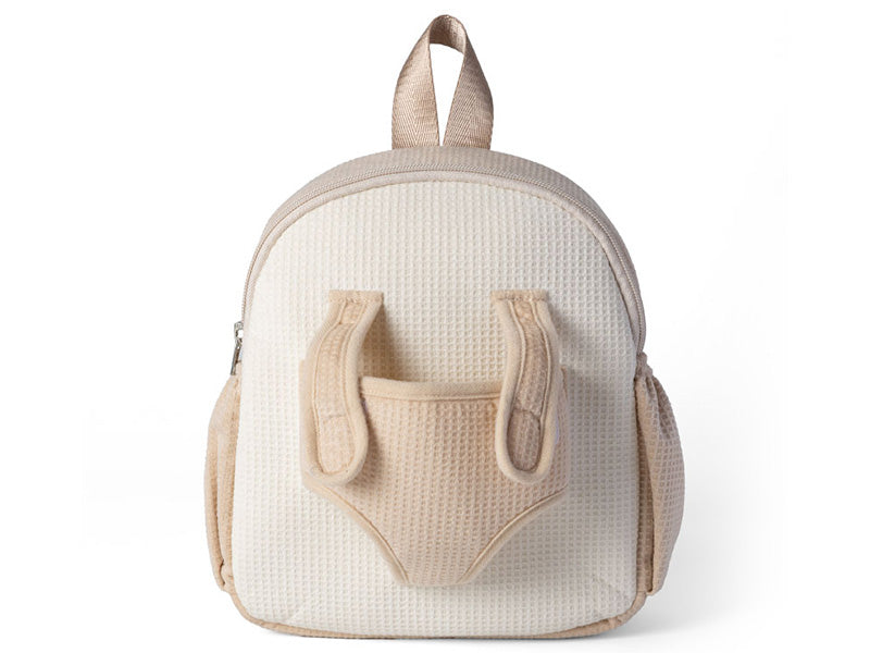 Dieser Rucksack mit dem Plüschtier wiegt zusammen etwa 670 g, was ungefähr dem Gewicht von 7 Pampers-Windeln entspricht. Wir empfehlen ihn für Kinder ab 18 Monaten, da er leicht und einfach zu tragen ist – der perfekte Begleiter für kleine Abenteuer.